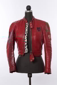 Hand painted leather jacket featuring Eddie Argos. Additional studs, band patches and buttons, roundbout Eddie Argos and his many creations and bands...More Photos